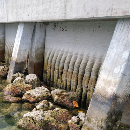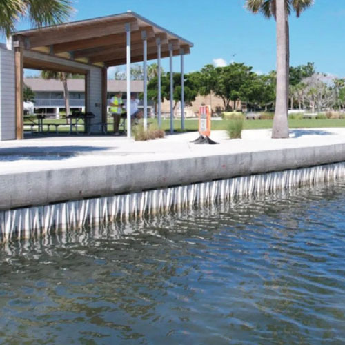 Advanced seawall designs built with marine-safe, non-toxic concrete and natural biomimicry patterns. These structures protect coastal assets while creating living marine habitats that improve water quality and enhance shoreline resilience.